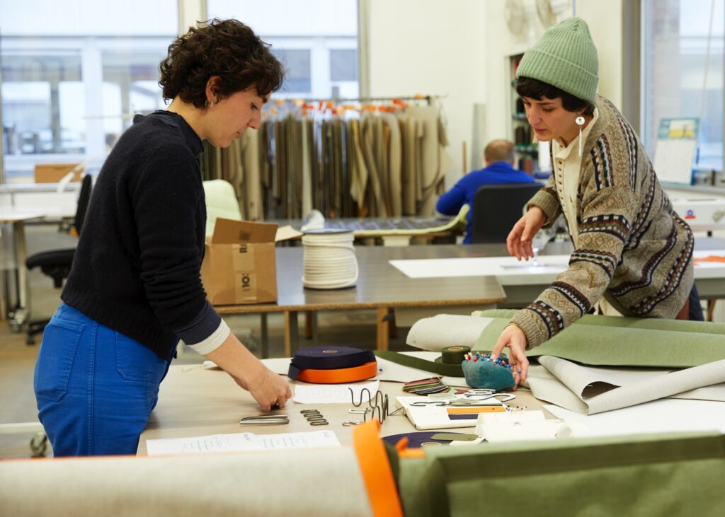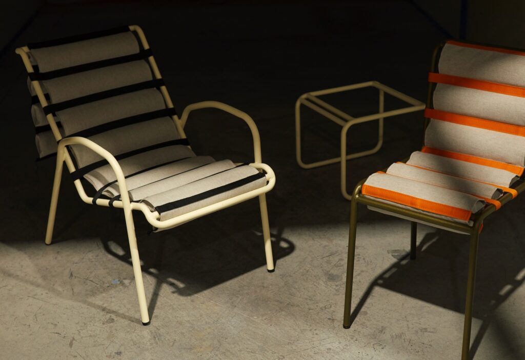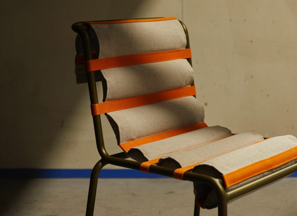 Spécialisé dans le design textile, Maak & Transmettre est un studio bruxellois composé de Salomé CORVALAN, Alice EMERY et Mathilde PECQUEUR. En collaboration avec rm-mobilier, elles ont revisité un modèle de chaise créé en 1958, la Lutetia, véritable icône de l’entreprise et témoin de son savoir-faire métalier originel. Avec une touche d’innovation, un brin d’originalité et une fibre textile, Maak & Transmettre met à l’honneur les autres savoir-faire de rm-mobilier : le matelassage et la couture.