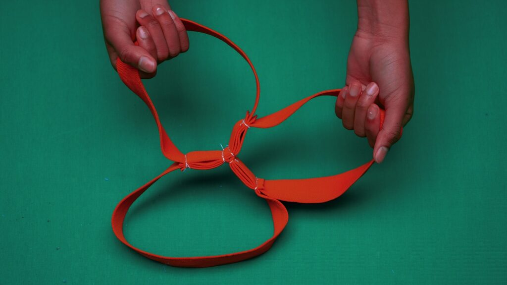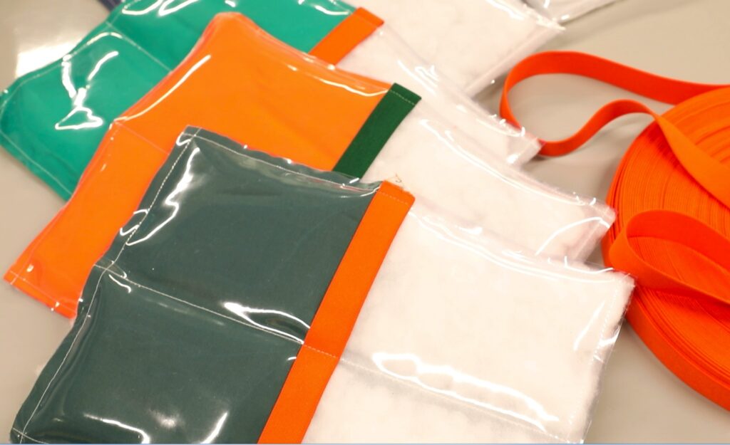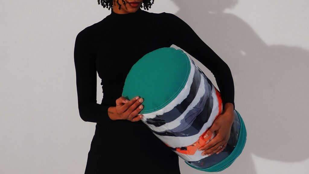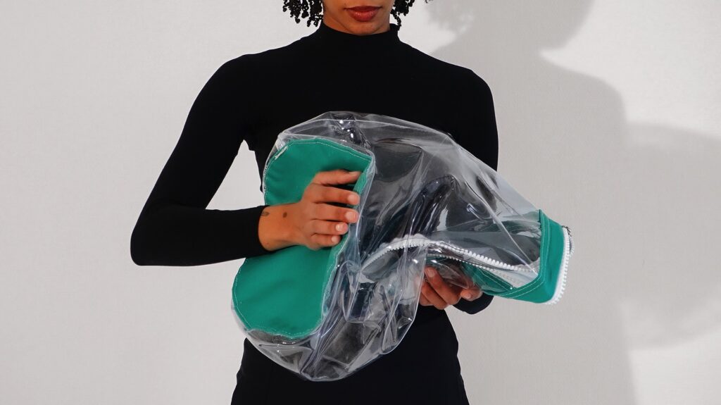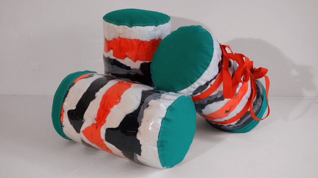 L'enveloppe transparente est fabriquée avec les chutes de production et le savoir-faire de BUBBLE TREE, un fabricant d'habitats gonflables situé dans la région Hauts-de-France. Le rembourrage provient des gisements variables de textile recyclés ou à recycler de chez DAGOBAIRE, une entreprise qui recycle les déchets textiles sur le territoire. Les sangles élastiques, la mercerie et les tissus colorés sont quant à eux sourcés dans des stocks dormants, par le biais de la matériauthèque du FASHION GREEN HUB ; une association d’entreprises engagées pour une transition durable et rapide des filières de mode et de textile.